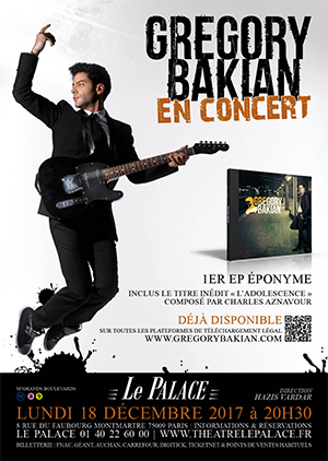 Après avoir donné le 29 janvier 2016 son premier grand concert à Paris, à l’Alhambra, sorti deux singles, “Ce Qui Ne Tue Pas Nous Rend Plus Fort” et “Je Prends”, disponibles en téléchargement légal, le chanteur, Grégory Bakian, se produira pour un concert unique, lundi 18 décembre 2017 à 20H30 au Théâtre Le Palace.